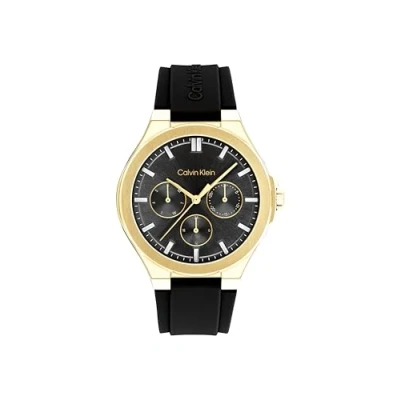 MULTIFUNCTION MOVEMENT FOR WOMEN – Calvin Klein VIBRANCY collection watch with precise multifunction quartz movement designed for modern women 38MM GOLD-TONE STAINLESS STEEL CASE WITH CROWN PROTECTION – Durable 38 mm case with 8.5 mm thickness in gold-tone stainless steel, featuring sporty crown protection for added style BLACK SUNRAY DIAL – Black sunray dial with baguette-style crystal hour markers that reflect light with elegance BLACK SILICONE STRAP WITH BUCKLE CLOSURE – Beveled black silicone strap with embossed logo and buckle closure for a secure, everyday fit 3 ATM WATER RESISTANCE – Designed by Calvin Klein for daily wear, splash resistant and ideal for an active lifestyle