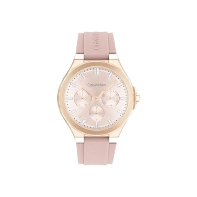 Multifunction movement for women - Calvin Klein vibrancy collection watch with precise multifunction quartz movement designed for modern women 38mm rose gold-tone stainless steel case with crown protection - durable 38 mm case with 8,5 mm thickness in rose gold-tone stainless steel, featuring sporty crown protection for added style Blush sunray dial - blush sunray dial with baguette-style crystal hour markers that reflect light with elegance Blush silicone strap with buckle closure - beveled blush silicone strap with embossed logo and buckle closure for a secure, everyday fit 3 atm water resistance - designed by Calvin Klein for daily wear, splash resistant and great for an active lifestyle