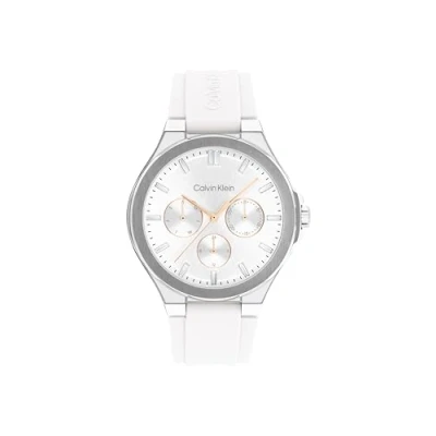 MULTIFUNCTION MOVEMENT FOR WOMEN – Calvin Klein VIBRANCY collection watch with precise multifunction quartz movement designed for modern women 38MM STAINLESS STEEL CASE WITH CROWN PROTECTION – Durable 38 mm case with 8.5 mm thickness in stainless steel, featuring sporty crown protection for added style WHITE SUNRAY DIAL – White sunray dial with baguette-style crystal hour markers that reflect light with elegance WHITE SILICONE STRAP WITH BUCKLE CLOSURE – Beveled white silicone strap with embossed logo and buckle closure for a secure, everyday fit 3 ATM WATER RESISTANCE – Designed by Calvin Klein for daily wear, splash resistant and ideal for an active lifestyle