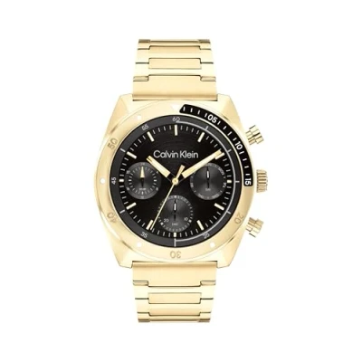 Movement Type: The Calvin Klein CK Flex men’s watch features a multifunction quartz movement, combining precise timekeeping with Calvin Klein’s modern, refined aesthetic for a bold, functional design. Case Dimensions: Designed for a sleek, contemporary look, this watch features a robust 42mm stainless steel case and a slim 11.75mm profile, ideal for both daily wear and special occasions. Dial: The striking black circular-brushed dial includes luminous accents for enhanced readability, while a unique black silicone insert on the bezel adds a sporty, modern edge that embodies Calvin Klein’s signature style. Bracelet: The H-link stainless steel bracelet with yellow gold ion plating enhances the Calvin Klein Flex watch with a refined touch of luxury, making it perfect for the modern man seeking elegance and sophistication. Water Resistance: 5ATM It may be worn while showering or swimming, but not scuba diving