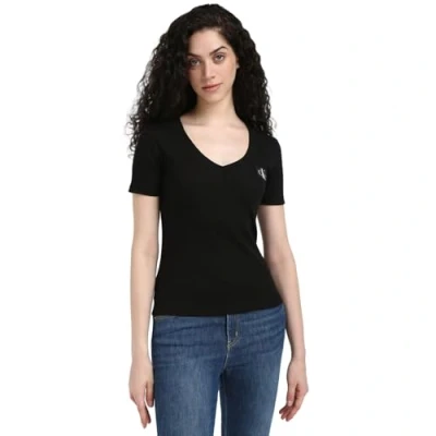Calvin Klein Jeans Women's Woven Label Ribbed Short Sleeve V Neck T Shirt, Black (Ck Black), XXS