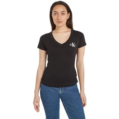 Calvin Klein Jeans Women's 2 Pack Short Sleeve V Neck Monologo T Shirts, Black (Ck Black/Bright White), XXS