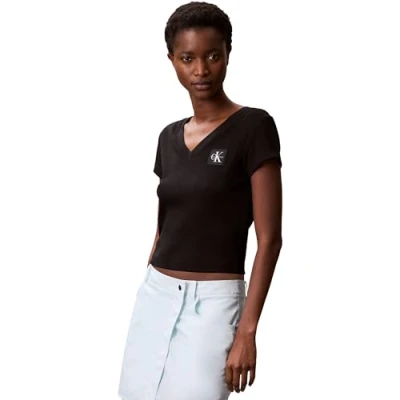 Calvin Klein Jeans Woven Label V NECK TEE Basic Tshirt, Women's, Size: 3XS, Black