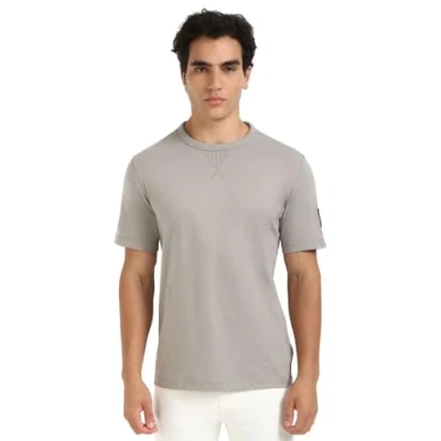 Calvin Klein Men's Regular Fit Round Neck Short Sleeve Badge T Shirt, Grey (Rock Ridge), XXS