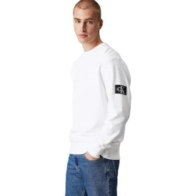 Calvin Klein Men’s Crew Neck Badge Cotton Sweatshirt, White (Bright White), XXS