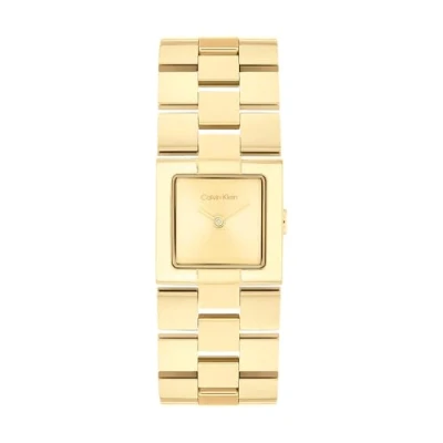 Precise 2-Hands Quartz Movement The Calvin Klein Meridian watch is powered by a reliable 2-hands quartz movement, delivering precision and effortless functionality for everyday wear. Unique Square Case in Sleek Dimensions With its 22 mm square-shaped case and slim 5 mm thickness, the CK Meridian watch redefines the classic tank silhouette for a modern, fashion-forward aesthetic. Minimalistic Gold Sunray Dial The gold sunray dial radiates subtle elegance, with its clean design enhancing the collection's contemporary femininity. Gold Ion-Plated Stainless Steel Bracelet with Grid Design The jewelry-inspired stainless steel bracelet, finished with luxurious gold ion plating, features a bold grid design that enhances the refined and modern aesthetic of the CK Meridian collection. Water Resistance: 3ATM Resistant to water splashes and rain as long as the case, crown, and crystal remain intact.