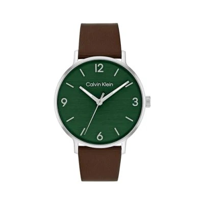 3-HAND QUARTZ MOVEMENT FOR MEN – This Calvin Klein watch from the MODERN family blends contemporary design with precision through its three-hand quartz movement and oversized hands 42MM STAINLESS STEEL CASE – 42 mm polished stainless steel case with a slim 7.9 mm profile, ideal for Calvin Klein’s modern and refined style GREEN DIAL WITH HORIZONTAL BRUSHED FINISH – Green dial with horizontal brushed texture and stick and numeral markers, aligned with the clean aesthetic of the MODERN collection BROWN LEATHER STRAP – Smooth brown leather strap with buckle closure, combining comfort with timeless Calvin Klein style 3 ATM WATER RESISTANT – Calvin Klein watch resistant to occasional splashes, perfect for everyday wear with minimalist elegance