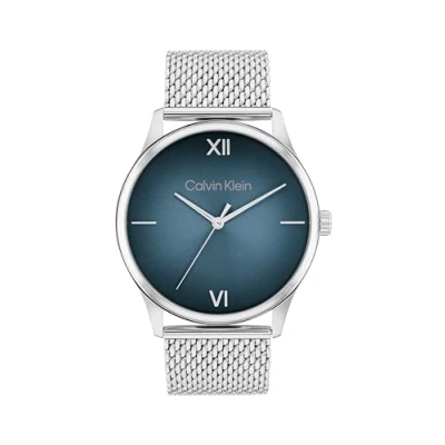 3-HAND QUARTZ MOVEMENT FOR MEN – The Calvin Klein ASCEND watch delivers precision and minimalist design tailored for the modern man 43MM STAINLESS STEEL CASE WITH 10MM THICKNESS – Robust and elegant case combining durability with refined aesthetics, perfect for an urban and sophisticated look TEAL DIAL WITH GRADIENT AND SUNRAY FINISH – Elevated dial with roman and stick indices bringing a classic and contemporary touch typical of Calvin Klein STAINLESS STEEL MESH BRACELET – Flexible and elegant bracelet that complements the refined design, ensuring comfort and a secure fit 3 ATM WATER RESISTANT – Ideal for daily wear and protected against accidental splashes, maintaining functionality without sacrificing elegance