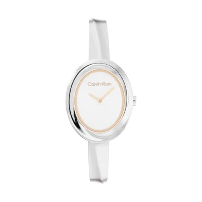 2-HAND QUARTZ MOVEMENT FOR WOMEN – This watch offers precise timekeeping and a minimalist design perfect for contemporary feminine style 26MM STAINLESS STEEL CASE WITH TWISTED BEZEL – Slim 7.7 mm profile blending elegance and modernity, a signature of the Calvin Klein TWISTED BEZEL family WHITE DIAL WITH PEARLIZED FINISH – The white dial with a pearl effect adds a sophisticated and luminous touch, enhancing Calvin Klein’s iconic design ADJUSTABLE STAINLESS STEEL BANGLE BRACELET – Softly sculpted bangle bracelet with clasp closure for comfort and a modern feminine look 3 ATM WATER RESISTANCE – Designed for accidental splashes and daily wear without compromising style or functionality