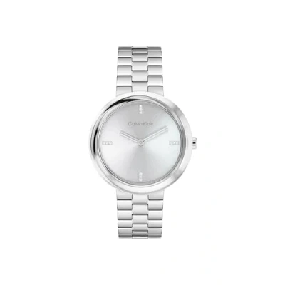 2-HAND QUARTZ MOVEMENT FOR WOMEN – The Calvin Klein TWISTED BEZEL watch blends precision and minimal elegance with a modern everyday design 34MM STAINLESS STEEL CASE – A 34 mm stainless steel case with a slim 7.7 mm profile and sculpted twisted bezel for a distinctive, refined look SILVER SUNRAY DIAL – The silver sunray dial of the Calvin Klein TWISTED BEZEL features baguette crystal markers that catch the light beautifully SILVER STAINLESS STEEL BRACELET – Sleek link bracelet in stainless steel with clasp closure, designed for a comfortable and polished fit 3 ATM WATER RESISTANCE – Stylishly crafted by Calvin Klein for everyday wear with 3 ATM water resistance, perfect for light splashes
