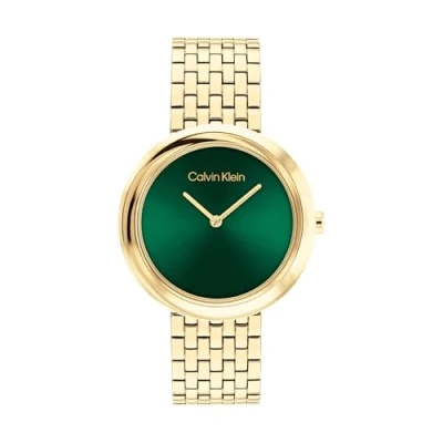 2-HAND QUARTZ MOVEMENT FOR WOMEN – The Calvin Klein watch from the TWISTED BEZEL collection offers easy and accurate timekeeping with a minimalist design made for modern everyday wear 34MM YELLOW GOLD STAINLESS STEEL CASE WITH TWISTED BEZEL – Slim 7.7 mm profile with a sleek, modern design highlighted by the collection’s signature twisted bezel GREEN SUNRAY DIAL – The green sunray-effect dial delivers a refined aesthetic that captures the light beautifully, enhancing Calvin Klein’s iconic design YELLOW GOLD STAINLESS STEEL BRACELET – Multi-link bracelet with a clasp closure ensures a secure and elegant fit with a feminine, contemporary look 3 ATM WATER RESISTANCE – Built for daily wear and splash resistance without compromising style or practicality
