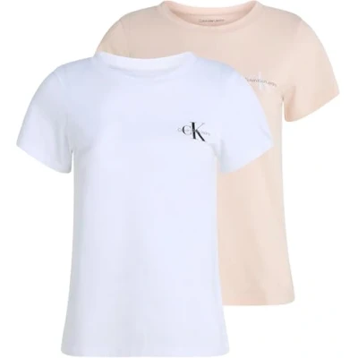 Calvin Klein Women’s 2 Pack Monologo Short Sleeve Slim Fit T Shirts, Multicolor (Silver Peony/Brilliant White), S