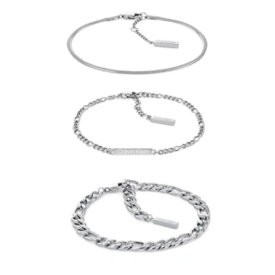 Unique gift set of 3 bracelets by Calvin Klein Material: Stainless steel Inner circumference: 17 cm Embellished with Etched Calvin Klein logo on the extender Closure: Lobster Claw Clasp