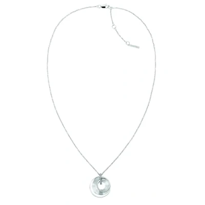 Crystal-set elegance. Distinctive necklace featuring interlocked rings - one featuring crystal settings for a stylish look. Material: Stainless steel Necklace Length: 51cm plus Extender: 5cm Embellished with Etched Calvin Klein logo on the disc Closure: Lobster Claw Clasp