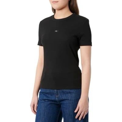 Calvin Klein Women’s Short Sleeve Woven Label Slim Fit Rib T Shirt, Black (Ck Black), XXS