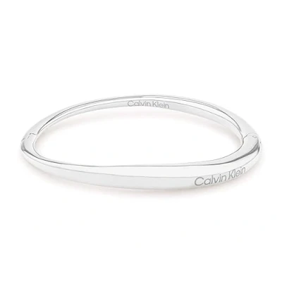 Ladies Bangle Bracelet by Calvin Klein Material: Polished Stainless Steel Inner circumference: 16 cm Embellished with etched Calvin Klein logo Closure: Hinged Clip