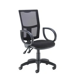 Deep cushioned seat and back upholstered in a tough wearing fabric. Permanent contact back (PCB) ensures user comfort for up to 8 hours. Suitable for up to 8 hours use. Twin wheeled, hooded, nylon castors. With fixed arms.