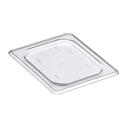 176(W)mm. Polycarbonate. Clear. Durable flat cover to fit Cambro polycarbonate GN1/9 food pans. Snap tight covers do not come off during transportation. Moulded top rails for safe, secure stacking.