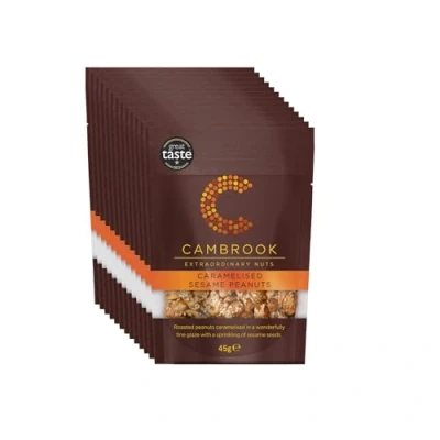 Roasted peanuts caramelised in a wonderfully fine glaze with a sprinkling of sesame seeds Case of 12 x 45g Free from artificial colours, flavours or preservatives Suitable for vegetarians Here at Cambrook we pride ourselves on being specialist producers of Brilliantly Caramelised Nuts and Brilliantly Baked Nuts. We use only the best ingredients and traditional methods to ensure each and every nut is extraordinarily good.