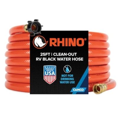 Clean-Out RV Sanitation Hose: Camco’s Rhino 25' Clean-Out Hose efficiently cleans out black and RV grey water tanks, or RV portable waste tanks for a more sanitary experience. 25' Extended Length: With a generous 25' length and 5/8″ internal diameter, accessing your RV's sewer tanks is hassle-free, eliminating the need to maneuver your camper for dumping— streamlining the process & enhancing efficiency. Universal Fit: Equipped with threaded ends, this RV must-have connects to standard hose fittings found on drain outlets, tank & hose rinsers, making it a versatile RV essential for any camper. Highly Visible Design: This camper essential Features a distinctive vibrant orange color that sets it apart from drinking water Hoses, significantly improving safety and hygiene by preventing any potential mix-ups. Durable Construction: Built to endure tough outdoor conditions, this Heavy-Duty hose is made of reinForced PVC, offering long-lasting reliability.