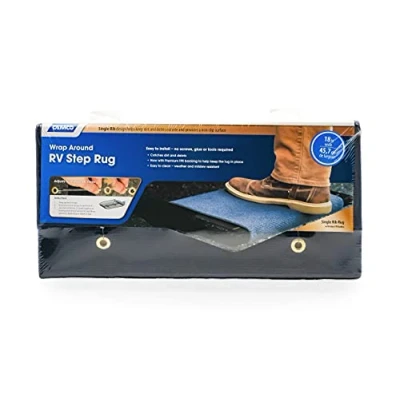 Single Rib Design helps keep dirt outside your RV and provides a non-slip surface for your RV steps. Comfortable rug texture provides a cushioned step and exterior accent for your RV or mobilehome. Made of durable, weather-tolerant materials that is tolerant to sun-damage, trap dirt and absorb moisture. Also constructed with Premium TPE backing to help grip RV steps and fits rug in place. Bendable rug structure is designed with sturdy grommets and hooks to adjust rug for a snug fit on RV steps An Effortless install, fitting most RV manual and electric steps. No screws, glue or tools required! Also easy to remove for cleaning and maintenance. Made of polyester and can be cleaned simply with just soap and water Each rug measures 17.5” long x 18" wide and is available in an assortment of colors, sizes, and styles all made by Camco