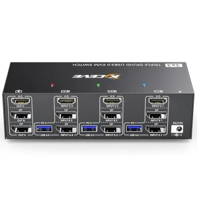 【HDMI+2 Displayport KVM Switch Triple Monitor】This 8K KVM Switch 3 Monitors is very suitable for devices with DP and HDMI interfaces, realize 3 computers share a set of mouse, keyboard and 3 monitors. It supports extended and mirrored display modes, extended mode can output three different screens and mirror mode can output three identical screens. Please Note: Each PC needs 1 HDMI + 2 DP + 1 USB cable to plug into the KVM switch 【Triple Monitor KVM Switch Support Ultra HD 8K】HDMI Displayport KVM switch 3 Monitors 3 Computers is compliant with Displayport 1.4 and HDMI 2.1 standard. Displayport part supports max resolution up to 8K@30Hz/4K@144Hz; HDMI part supports max 8K@60Hz/4K@120Hz, hdmi displayport kvm switch ensures you enjoy a crystal-clear image with no pixelation or delay, in order to achieve the highest resolution, ensure that the signal source, HDMI cable/DP cable all support 8K@60Hz 【KVM Switch 3 Monitors with 4 port USB 3.0】Camgeet USB 3.0 KVM switches with 4 integrated USB 3.0 ports, supports ultra-fast 5Gbps data transmission,which can recognize keyboard, mouse, printer, scaner, USB flash drive and other USB devices. kvm switch is made of high-quality, durable metal material for reliable and long-lasting performance 【Wide Compatibility & 2 Switching Ways】The DP HDMI KVM Switch is compatible with Laptop, Desktops, PS5, PS4, Raspberry Pi, DVR and most operating systems, such as Windows, Vista, XP, Mac OS, etc; you can switch between 3 computer through wired remote controller(included) or physical button, LED indicators clearly show the active computer, which are easy to switch and make your workspace tidier 【12V DC Power Port & Power Switch】KVM 3 Monitors is equipped with a 12V power port for high power USB devices and a separate power switch. Simply press the power switch to restart the KVM when signal re-recognition is needed, eliminating the hassle of repetitive plug and unplug actions 【IMPORTANT NOTE】(1) Each PC needs 1x HDMI+2x DP+1x USB cable to be connected to get triple screens; (2) Before connecting the kvm switch, please connect your computers to 3 monitors directly to ensure that multi-screen output is supported. (3) Adapters will be needed if your PC does not have 2x DP+1x HDMI ports. KVM switch 3 PC 3 monitors supports a variety of converters and docking stations 【Worry-Free After Sale Service】You will get: 1x Triple Monitor KVM Switch, 3 x USB 3.0 Cable, 1x Power Adapter, 1x Wired remote, 1x User's manual. Besides this, Camgeet provides 12 months warranty and lifetime technical support for this HDMI Displayport KVM Switch. Feel free to contact the seller if you need any help, we will respond to you as soon as possible