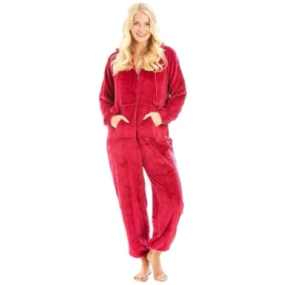 Camille Super Soft Zip Up Hooded Onesies for Women Thick Luxury Fleece Full Length Women's All In One Long Sleeved with Elasticated Cuffs Magenta 10 12