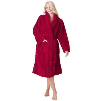 Camille Women's Super Soft Dressing Gown Luxury Fleece Shawl Collar Bathrobe Long Sleeved, Belt Fastening & Front Pockets 14 16 Burg
