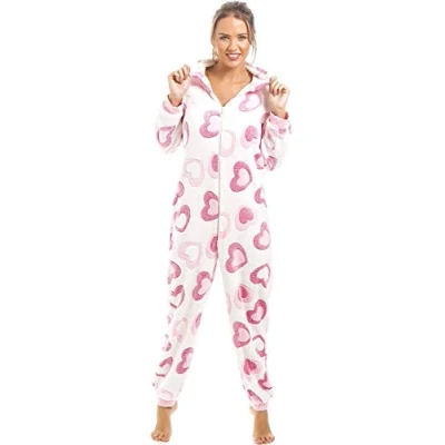 Camille Women's Super Soft Fleece Onesie Hooded Heart Print All in One Long Sleeved Pink 14 16