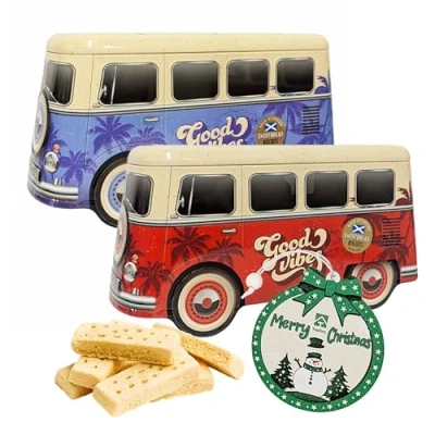 Bring a touch of nostalgia to tea time with this Decorated Camper Van Shortbread Biscuits gift set, a charming keepsake filled with buttery Scottish shortbread cookies. This unique biscuit tin is as much a collectible display piece as it is a delicious treat. Perfectly sized at 320g, it’s ideal for sharing, gifting, or enjoying all to yourself. You will get 1 RANDOMLY SELECTED Red or Blue Camper Van biscuit tin with Topline Christmas Tree Decoration. Looking for the perfect stocking fillers or Secret Santa gifts? This charming Camper van biscuit tin is a fun and practical gift for camper van lovers. Perfect for storing biscuits, cookies, or snacks, it features a quirky camper design that adds retro style to any kitchen. A delightful keepsake, it makes a thoughtful present for Christmas gifts Inside the eye-catching Red or Blue camper van tin, you’ll discover 320g of traditional Scottish shortbread biscuits, crafted to a time-honored recipe for that signature rich, crumbly texture and melt-in-the-mouth buttery flavor. Whether enjoyed with a hot cup of tea, coffee, or cocoa, these biscuits gift set bring a touch of indulgence to cosy winter evenings. Each bite is a reminder of the comfort and tradition that makes Christmas so special. Topline Christmas Tree Ornament – Snowman & Trees Design: crafted in a round, lightweight wooden bauble shape with a cheerful snowman and evergreen trees, it’s framed by a green border decorated with white stars and topped with a large festive bow. Dimensions: 7.9cm x 7.4cm Perfect for Christmas trees, gift embellishments or holiday décor accents. Celebrate the holidays, birthdays, or everyday moments with this Shortbread Biscuits Tin. It’s a delightful blend of traditional Scottish baking and nostalgic design, offering both a tasty treat and a keepsake treasure. A gift that will be remembered long after the biscuits are gone.