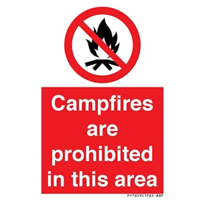 P045 : No campfire This sign is made from vinyl / sticker Air Release vinyl makes it easy to stick to flat, clean surfaces without bubbles. Not for rough, plastic or dusty surfaces. A8 portrait Sign Text: Campfires are prohibited this area