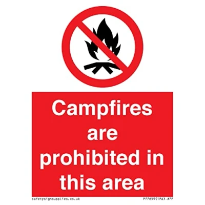 P045 : No campfire This sign is made from vinyl / sticker Air Release vinyl makes it easy to stick to flat, clean surfaces without bubbles. Not for rough, plastic or dusty surfaces. A7 portrait Sign Text: Campfires are prohibited this area