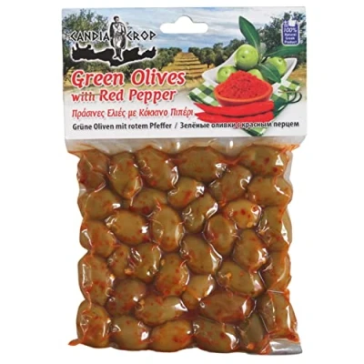 Chalkidiki green olives, one of the most famous Greek table olives in the world, marinated with regional red pepper for a more spicy taste. They are full-bodied, with a smooth and meaty texture. Rich in polyphenols, healthy fats and fibre. They are great source of energy, vitamins and antioxidants. 100% Natural Product | 100% Greek Product | No Additives | Suitable for Vegetarians This delicious marinated green olives are ideal for cheese boards. Try this Mediterranean gift with yellow and white cheeses, fresh bread and breadsticks. Enjoy this Greek Meze with ouzo, tsipouro, wine and good company! Make the famous Greek salad by mixing fresh tomatoes, cucumber, feta cheese and the green marinated olives. Finish by topping with Greek olive oil and oregano.