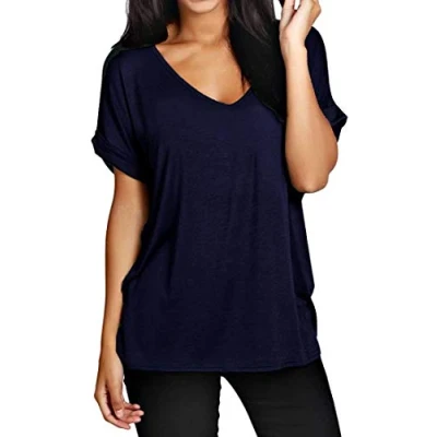 Candid Styles Women Baggy Oversized Loose Fit Turn up Batwing Sleeve Ladies V Neck Top T Shirt, M/L 12 14, Navy Short