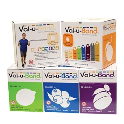 Ideal for therapy and rehabilitation, Fitness and muscle strength, for associations and practices, as well as for working out at home The cost-effective alternative to traditional exercise bands. Very good quality like the CanDo and Thera-Band exercise bands Come in 5 colour-labeled resistance strengths: XX easy / peach, X easy / orange, easy / light green, medium / blueberry and difficult / plum. The darker the colour, the more resistance the band has Available in different lengths: 5.5 m, 45 m and 2 x 45 m. Also available in set of 5 With or without latex Alternative to dumbbells Flexible use during training Resistance training anywhere, anytime