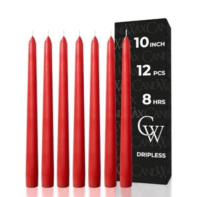 Confidence in Red Candle Sticks - Candwax offers you various sets of taper candles, a rich and stylish color scheme, a big number of tapered candles in packages and the main thing is the quality and safety of our candle sticks. 25cm red Christmas dinner candles have 8 hours of burn time. Pleasant twilight, warm water, scented foam, and shimmering red dinner candles light. Imagine it… What can be better if you want to stop the time and relax? Clean burning candles - Due to special construction our red taper candles are dripless and do not leave wax marks on the table or in the red candle holder. We make tapered candles only from quality colored wax, so when the taper candle burns you will see wax of the same color as the long candles itself. When you look at a red candles light you will be charmed, its straight and soft light will not leave you indifferent. Versatile decor - Unscented red long candles will be a perfect accessory in your house. Make your routine/everyday rituals such as dining, bathing and others more spiritual and relaxing. Take pleasure from each moment of your life with tapered candles 25cm. We have all the classic colors of tall candles they will match any design and increasing the level of comfort. Unscented Christmas red tall candles - In addition to being dripless, our emergency candles are also smokeless while burning, making them perfect for those who are sensitive to strong odors. Dripless candles allow you to emphasize specific pieces of furniture. For instance, a large fireplace can become more attractive when adorned with bulk red taper candles. These candles fit into standard taper candlestick holders. Remember to place the red candle on a flat surface away from drafts. Multi-purpose use - Do you want to create an atmosphere of relaxation? Or do you need to decorate your wedding party? Our tapered dinner candles dripless height will add some chic to your dining table. Dripless unscented candles will create the muffled light. As we provide different stylish colors for no drip taper candles they become ideal as wedding candles. You can choose the perfect table candles color that fits exactly into the color scheme and style you choose for your wedding.