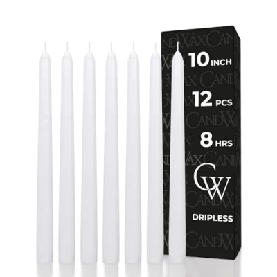 Сonfidence in unscented white candles - Candwax offers a variety of decorative candles, including different colors of tall candles. Taper candles white, like our other candles, contain our love because we understand the value of every moment while our white dripless taper candles emit their warm light. Despite our 25 cm candles don't last forever, they have a burning time of up to 8 hours. Clean burning candles - Due to special construction our white candlesticks 25 cm do not drip and they do not leave wax marks on the table or the candlestick. We make white candle sticks only from quality colored wax, so when the taper candle sticks white burn you will see wax of the same color as the long candles Christmas itself. When you look at a white tapered candles you will be charmed, its straight and soft light will not leave you indifferent. Versatile decor - White candlesticks dripless will be a perfect accessory in your house. Make your everyday rituals such as dining, bathing, and others more spiritual and relaxing, as well as special occasions, like Christmas celebration, Thanksgiving festivities or enjoying the Advent. Take pleasure from each moment of your life with white taper candles 25 cm. We have all the classic colors of holiday candles white they will match any design and increase the level of comfort. Fragrance-free - In addition to being dripless, our tall white candlesticks are also smokeless while burning, making them perfect for those who are sensitive to strong odors. Dripless candles allow you to emphasize specific pieces of furniture. For instance, a large fireplace can become more attractive when adorned with white taper candles. These white candles fit into standard taper candlestick holders. Remember to place the white candle stick on a flat surface away from drafts. Versatile decor for special occasions - Elevate any event, from wide weddings to close gatherings, with our white taper candles 25 cm dripless. Crafted not only as Christmas candles but also for any other convenient occasion - whether it's wedding candles, Advent candles, or Valentine candles - it's all about our white long candles aesthetic. These cute candles create an atmosphere of warmth and comfort, providing moments of joy and relaxation. Let's create the best memories together!