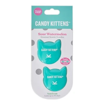 VENT IT OUT: These sleek car air fresheners pack a punch. With a fresh pop of scent they gently release feel-good fragrance from your vents every mile you drive. VIBES FOR MILES: Our scent-sational Sour Watermelon twin vent air fresheners give you epic vibes and miles of fun on every drive. Upgrade your car game with Candy Kittens. SCENTS FOR DAYS: Surround yourself with the sweet scents of Candy Kittens car air fresheners. Your newest car companions for up to 45 days of fragrance. PLAYFULLY REIMAGINED: We've bottled up the cheeky charm of Candy Kittens and added a splash of scent-sational goodness. Your favourite gourmet sweets playfully reimagined into a paw-fect blend of fun and fragrance for your car. THE PURR-FECT GIFT: Got a mate who’s sweet but sassy? Wrap up the scent of fun. These playful air fresheners are just the thing for anyone who loves cool design with a fragrant twist.