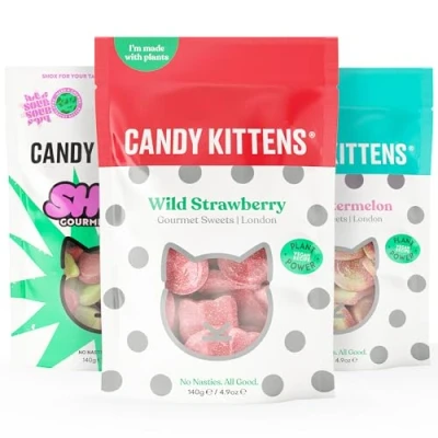 GOURMET VEGAN SWEETS: Whether looking for delightful snacks, thoughtful vegan gifts, or a sweet treat, Candy Kittens gourmet sweet bundles are the perfect choice for indulgence without compromise THREE AMAZING FLAVOURS: In this bulk sweets bundle, you’ll get: Wild Strawberry - intense strawberry flavour for classic sweet lovers, Sour Watermelon - one-in-a-melon flavour and, Shox - our first vegan gourmet sour with sour strawberry & apple NO NASTIES: Candy Kittens vegan and vegetarian sweets never contain gelatine or artificial colours and flavours! Our jelly sweets recipe gets its bounce from plant power MADE WITH FRUIT JUICE: Candy Kittens sweets are coloured and flavoured with responsibly sourced, plant based concentrates of sweet potato, turmeric, spirulina, and more FRUITY SWEETS MIX: Dive into our pick and mix bags of sweets, featuring a lively mix of chewy and fruity flavours that will tantalise your taste buds with every bit
