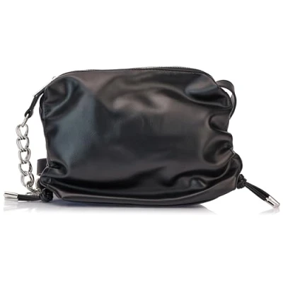 faux leather handbag Side drawstrings Long shoulder strap with chain detail Inner side made of textile