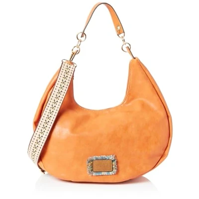 Faux leather shoulder bag Logo plate with colourful fringes Rounded shape Removable shoulder strap with pattern Inner compartment made of textile