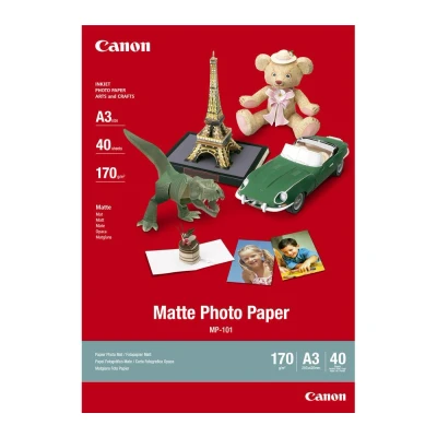 Choose Canon A3 MP-101 Photo Paper to achieve the sharpest, most vibrant results whether you're printing photos or text.This premium matte photo paper is ideal for producing high-quality photographs, graphics and text with a tasteful matte finish. You can also use it creatively in greeting cards, displays and other paper crafts.Because it's not glossy, it can be used for a variety of different presentation scenarios. It offers high brightness for vivid, clear images or crisply-defined text.Since it's so versatile, this high-quality 200 micron-thick, 170 gsm paper will lend an air of prestige to documents and presentations, so it's ideal for office or home use.A3 MP-101 Photo Paper is perfect for outputting soft-finish photographs or graphics with bold colours. The micro-porous coating quickly absorbs ink deep below the surface to stop any residual ink remaining, so instant-dry photo prints are possible.The ideal match for Canon Lucia and ChromaLife100+ inks, MP-101 Photo Paper combines seamlessly with Canon's FINE print head and inks to protect photos from gases and light to preserve your treasured memories for your family.Print your documents, presentations and photographs in the best possible quality with Canon A3 MP-101 Photo Paper.
