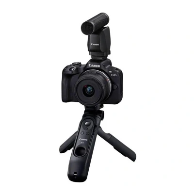 The EOS R50 comes equipped with a vari-angle touchscreen LCD, enabling flexibility while shooting from various angles—whether high, low, or flipped to face you. The compact design makes it easy to carry anywhere, perfect for capturing vlogs on-the-go. With the included grip, microphone, and stabilized lens, you can start creating content right out of the box.