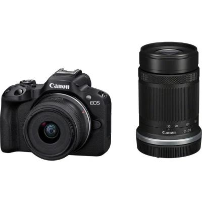 Stand out in your videos - not on the street. The Canon EOS R50 is small enough to be discreet and light enough to carry around anywhere. Shoot vlogs on the fly or get creative with a timelapse. The R50 has a few tricks up its sleeve too. It's smart enough to know when it's shooting vertical or horizontal - super handy for livestreaming. Creative bracketing gives you multiple edits for each image you take. The camera does all the hard work - just choose your favourite effect. And with a vari-angle touchscreen, you can work all the angles. Creating new content has never been so easy.Good to know- Its Dual Pixel CMOS AF II recognises and tracks subjects super quickly for reliable focusing- It can capture bursts of up to 15 fps while keeping the subject sharply in focus - then it's just a case of picking the best shot- Powered by the DIGIC X processor, the camera is quick to focus and take the shot- It uses 6K oversampling to give you uncropped 4K videos packed with detail- Built-in WiFi makes it easy to transfer photos to your phone and shoot remotely- Use guide mode to learn the ropes, or get stuck in with customisable controls- A maximum ISO of 32,000 helps capture more detail and less noise in dark scenes- The all-purpose 18-45 mm f/4.5-6.3 lens is a perfect match for vlogging and travelling- Whip out the 55-200 mm f/4.5-6.3 telephoto lens to capture wildlife and detail shots
