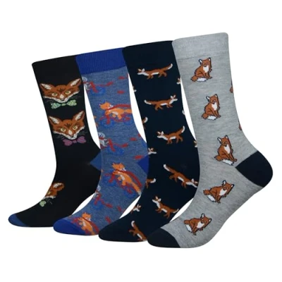 ADDED VALUES – 4 pairs in a pack (Fox Socks); Suitable for Men EUR size 40-44; - Perfect gifts for: birthday, Christmas, Father's day, Thanksgiving Day OCCASION: casual, home, work, party, school, office, indoor, wedding; - Not thick not thin, good for fall & winter and all year wear FASHION: a new way to show your unique fashion sense with our socks; Brighten up your day, keep everything fresh and stylish, restyle you from the bottom and out HIGH QUALITY: soft combed cotton multi-color 200-needle mixed knitting using rich and soft combed cotton for elasticity, anti-skidding, breathability and comfortability COMFORTABLE: 3-dimensional profiling for shape forming and comforts; - Elastic and enhanced cuffs hold socks comfortably in place; they will not dig into your shins; - Perfect for everyday wear, you're set for a more creative outfit