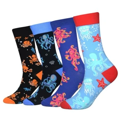 ADDED VALUES – 4 pairs in a pack (Octopus Socks); Suitable for Men EUR size 40-44; - Perfect gifts for: birthday, Christmas, Father's day, Thanksgiving Day OCCASION: casual, home, work, party, school, office, indoor, wedding; - Not thick not thin, good for fall & winter and all year wear FASHION: a new way to show your unique fashion sense with our socks; Brighten up your day, keep everything fresh and stylish, restyle you from the bottom and out HIGH QUALITY: soft combed cotton multi-color 200-needle mixed knitting using rich and soft combed cotton for elasticity, anti-skidding, breathability and comfortability COMFORTABLE: 3-dimensional profiling for shape forming and comforts; - Elastic and enhanced cuffs hold socks comfortably in place; they will not dig into your shins; - Perfect for everyday wear, you're set for a more creative outfit