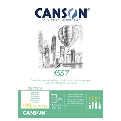 CANSON 1557 Extra White 120gsm A5 Sketch Paper, Light Grain, 50 Sheets, For Professional Artists & Illustrators