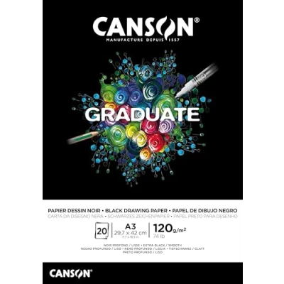 CANSON Graduate Black Drawing 120gsm A3 Paper, Smooth, Pad Glued Short Side, 20 Sheets, For Student Artists