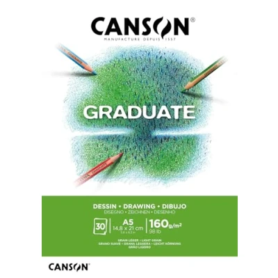 CANSON Graduate White Drawing 160gsm A5 Paper, Light Grain, Pad Glued Short Side, 30 Bright Sheets, Ideal for Student Artists