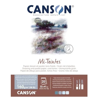 CANSON Mi Teintes Coloured Drawing 160gsm 12.6 x 16.1in Paper Pad, Double Sided: Honeycomb & Fine Grain, Glued Short Side, 4 Cool Tones, 20 Sheets, Ideal for Professional Artists Students